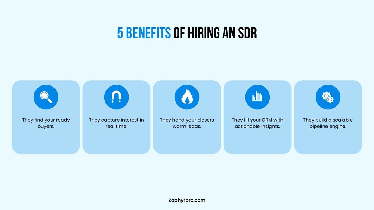 Hiring an SDR helps your sales team work better. This role lets each person focus on what they do best. Here are the main reasons to hire one.