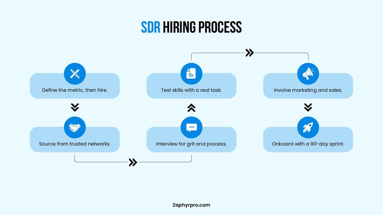 To hire an SDR, define your goals, write a clear job description, source candidates from job boards and referrals, conduct interviews focused on resilience and communication, give a practical skills test, and make a competitive offer with structured onboarding.